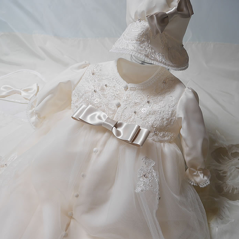 (元皇室衣装・ファミリアデザイナーの監修) 私たちのモノ作りの原点は、日本を代表するベビー服メーカー「ファミリア」にあります。皇室衣装とベビー服という、美しさと優しさの極致が求められる現場で培った感性と、熟練職人の確かな技術。一生モノを託せる安心をお約束します。