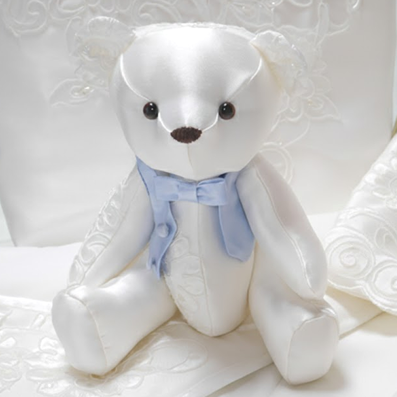 繊細なレースやビジューを、熟練職人が一体ずつ手作業で配置した気品あふれるメモリアルベア。リビングで、寝室で。ふとした瞬間にあの日の幸せな記憶が蘇る、あなただけの特別な「お守り」です。(インテリア・ベアについて詳しくはこちら)