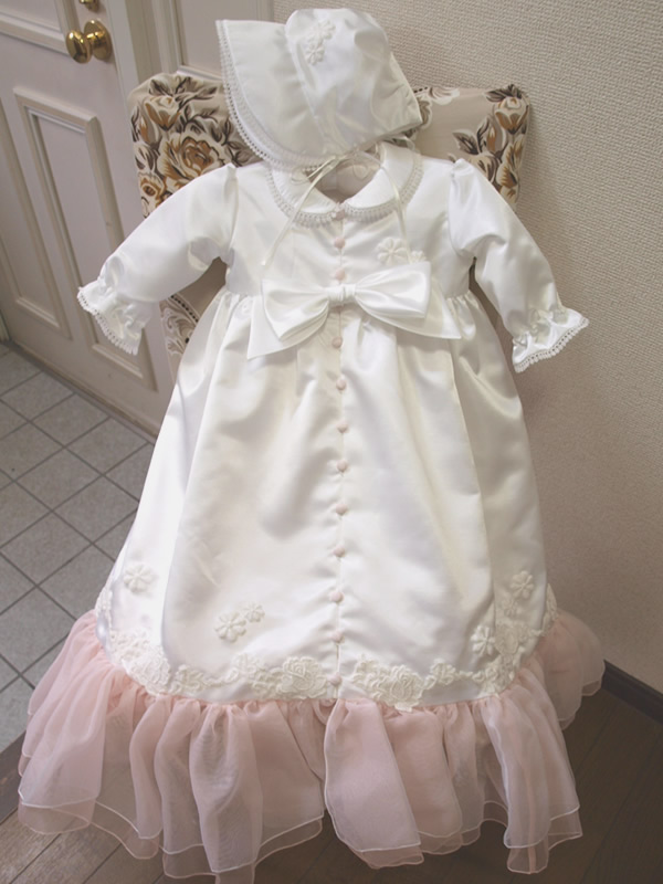 ベビー・子供・出産準備品ウェディングドレスに使われていたピンクのフリルをベビードレスにもアレンジしました。