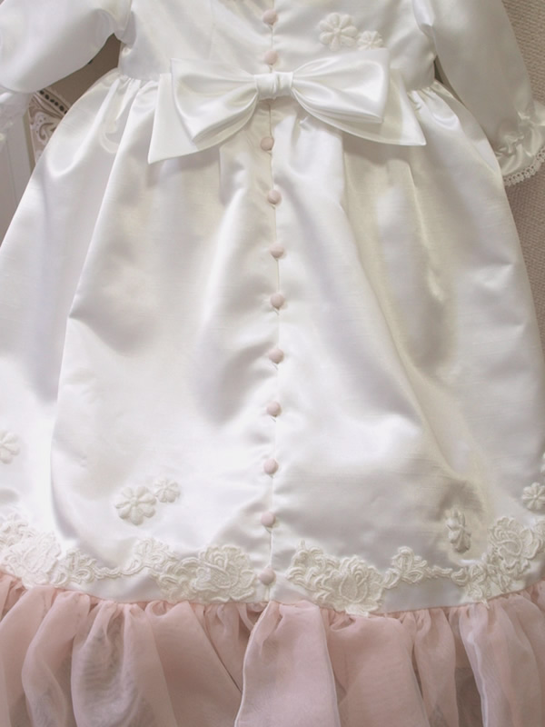 ウェディングドレスに使われていたピンクのフリルをベビードレスにもアレンジしました。
