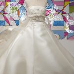 サッシュベルトリボンがアクセントのウェディングドレスを