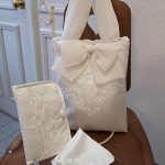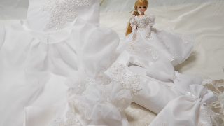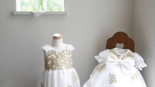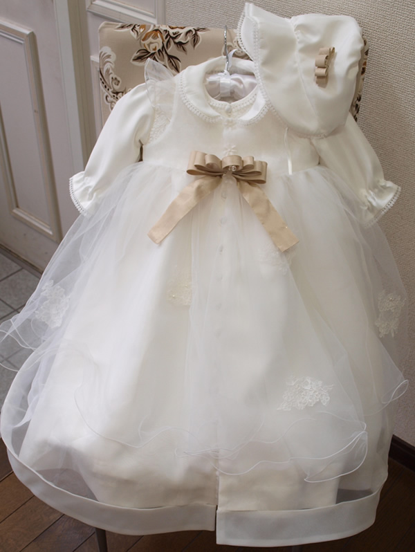 ベビードレスはウェディングドレスの太パイピングのモチーフを生かて