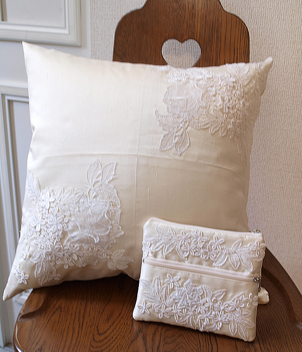 ウェディングドレスをクッションカバーとシンプルなポーチにリメイクしました。