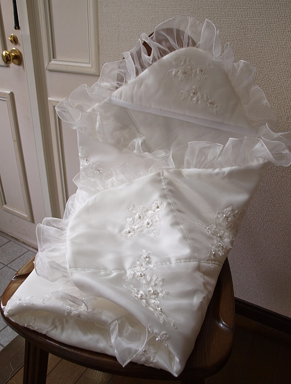 ドレスのレースを散りばめた、ふわふわおくるみに包まれて幸せそうなベビーの寝顔が目に浮かびます。