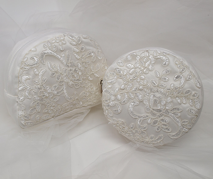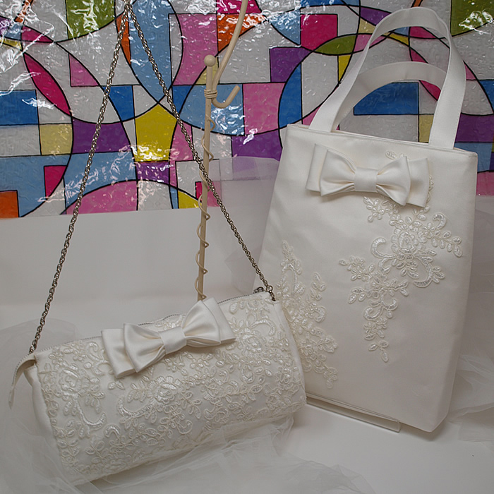 ウェディングドレスをフォーマルバッグやサブバッグ、ポーチにリメイクしました。