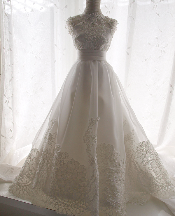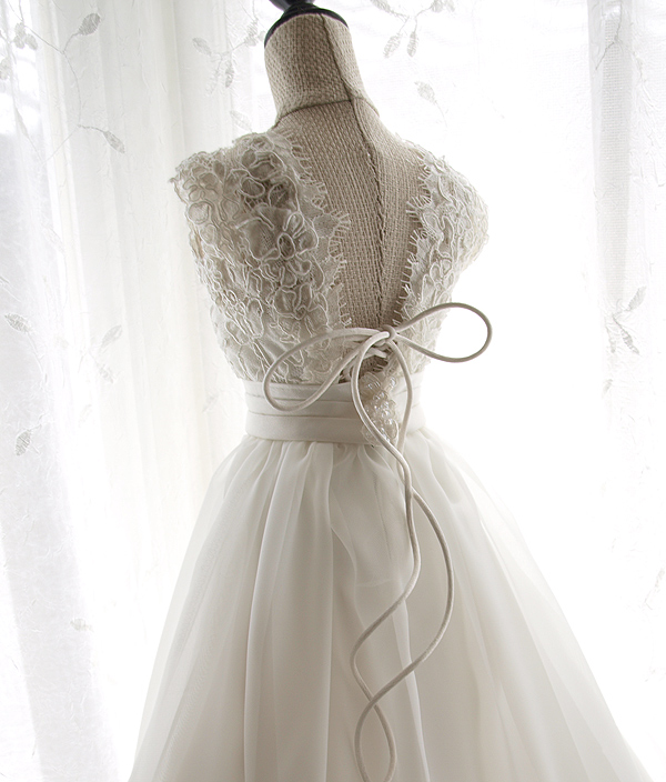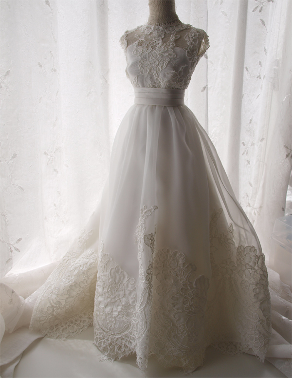 繊細なレースとシフォン使いが素敵なウェディングドレスをミニチュアドレスにリメイクしました。