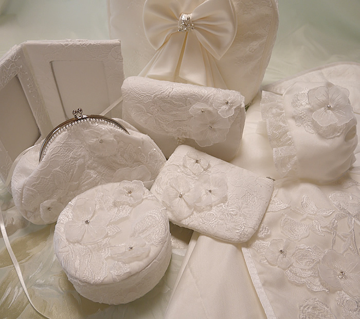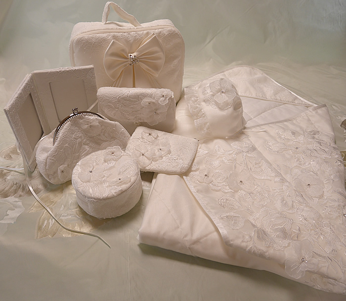 ウェディングドレスからおくるみやポーチなどの小物をたくさんお作りしました。