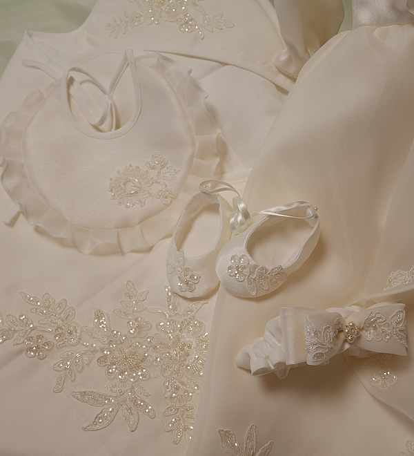おくるみやスタイ、シューズにもレースやフリルを使った