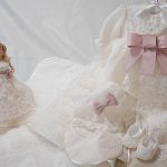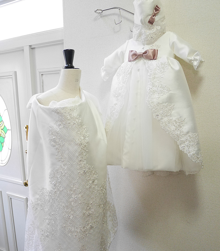 ウェディングドレスをお宮参りケープとベビードレスにリメイクしました。