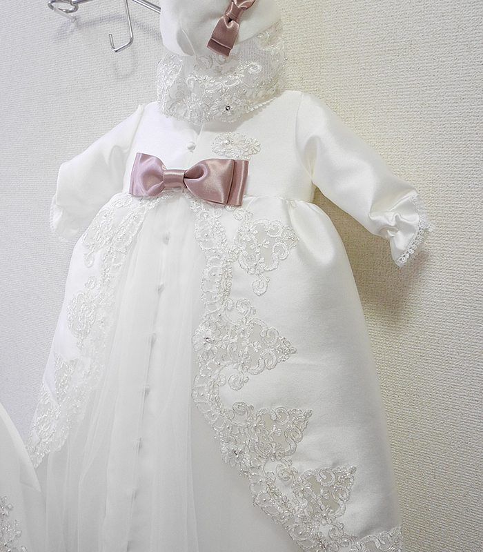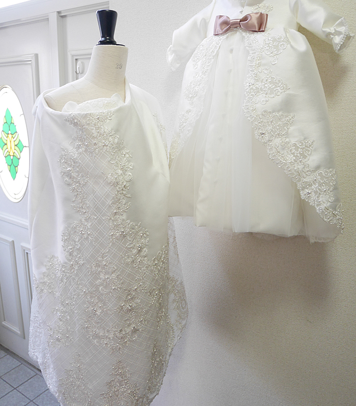 お宮参りケープは元ドレスのレースをいかした豪華でエレガントなデザイン。