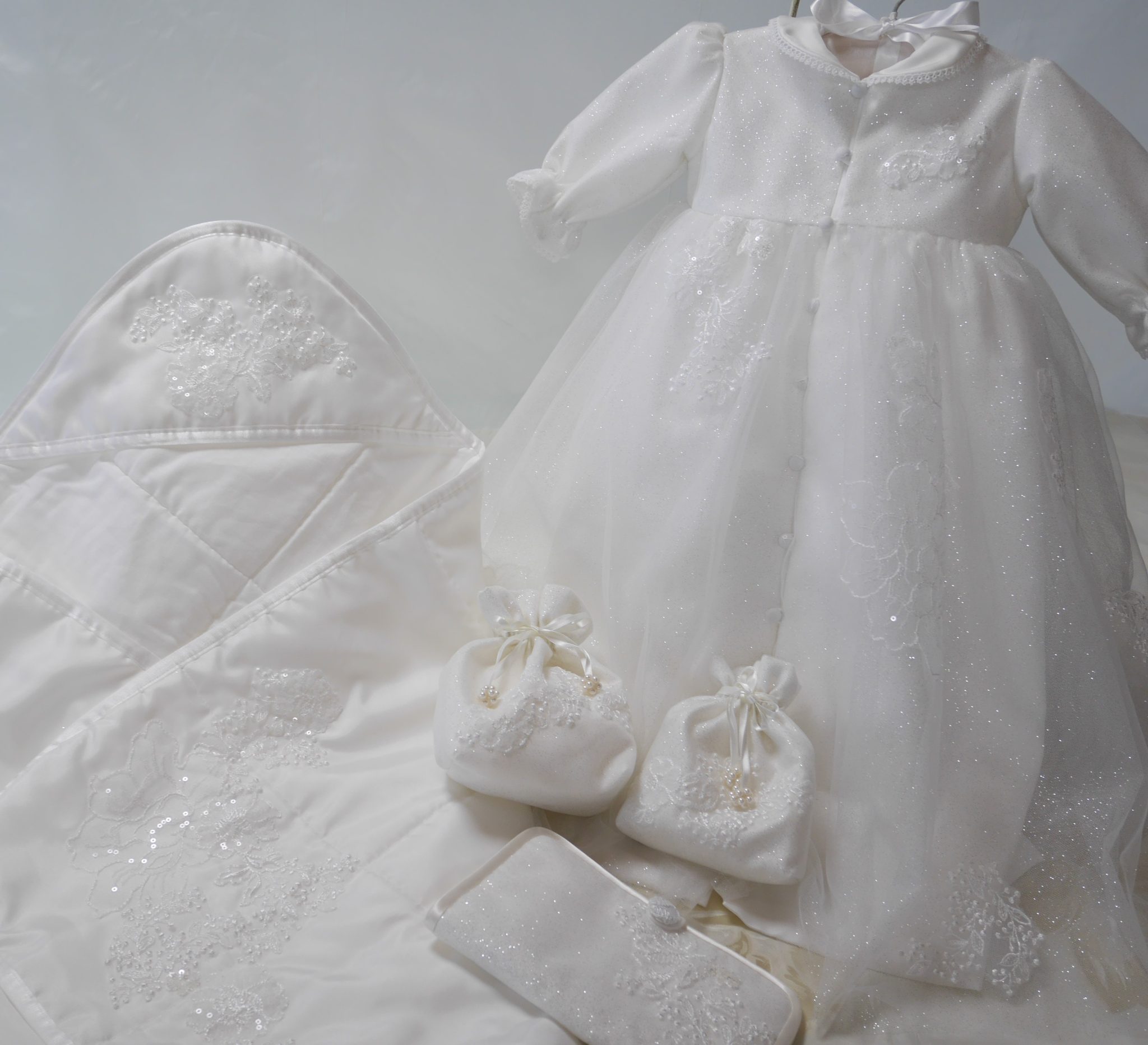 繊細レースのベビードレスと小物たち ベビー・子供・出産準備品 2025.10.11 ウェディングドレスからベビードレスとおくるみ、そして、母子手帳とポーチをお作りしました。どれもドレスの繊細なレース地を生かした、上品でシンプルなデザイン。ラメチュールも重ねていますので、キラキラとエレガントな作品に仕上がりました。 リメイクのお問合せはこちらから