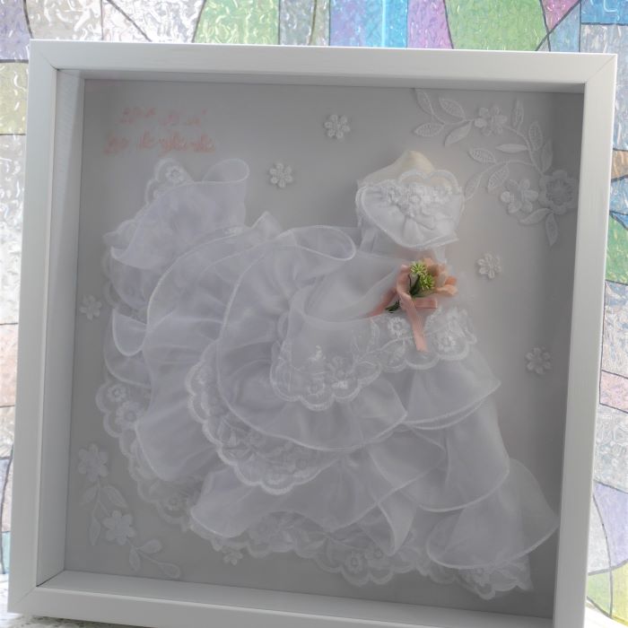 ウェディングドレスをミニチュアドレスのフレームとフォトフレームにリメイクしました。