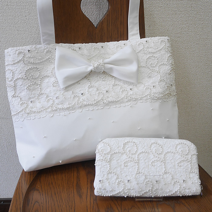 ウェディングドレスからサブバッグとお財布にリメイクしました。