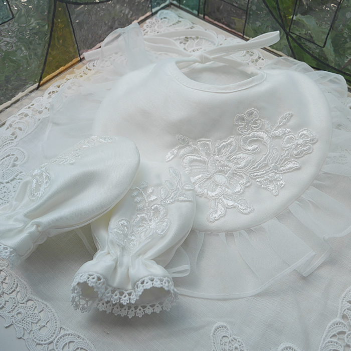 スタイやミトンの小物にはレースをカットして可愛くアレンジしています。