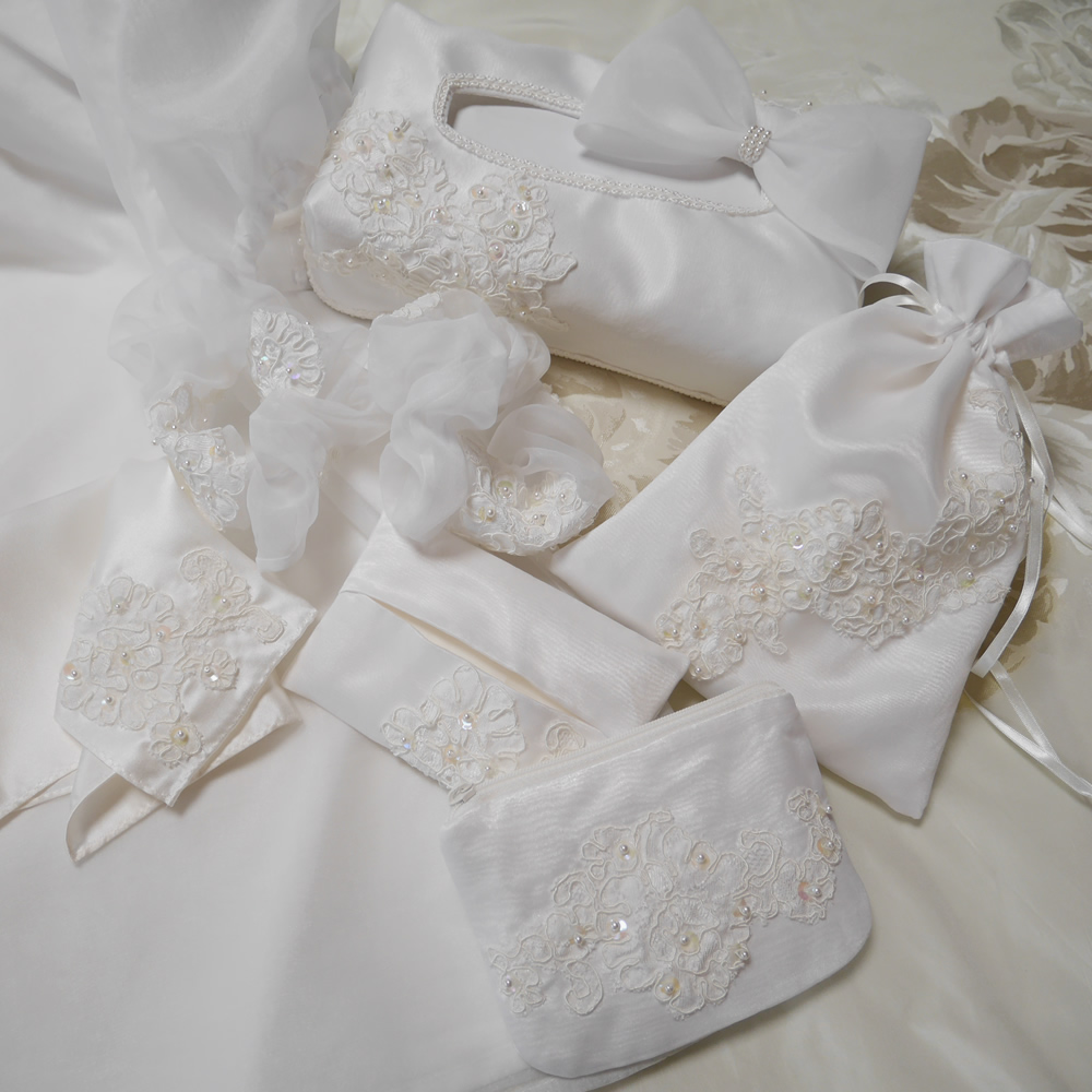 バッグ、ポーチ等はドレスと同じようにサテン地にオーガンジーを重ね