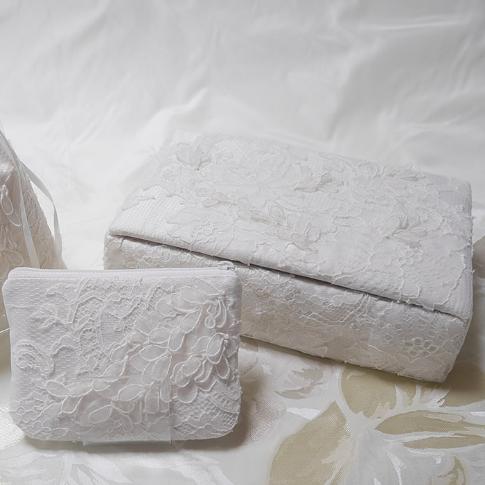 ウェディングドレスからアクセサリーボックスとポーチにリメイクしました。