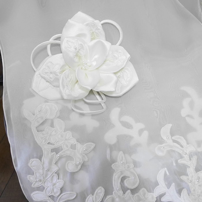 コサージュはドレス地とレースで花びらを作り、中心のパールボールで華やかに仕上げました。