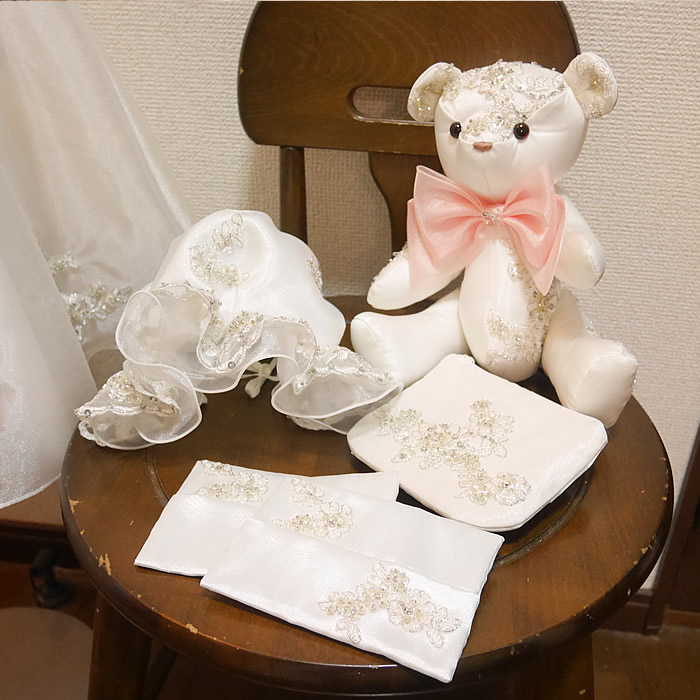 テディベアやティッシュケースもドレスの生地とレースで仕上げたキュートなデザインです。