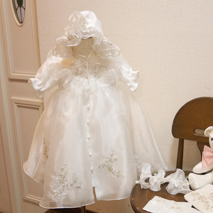 ファーストバースデードレスはレースの丸いヨークの周りにフリルをあしらい、