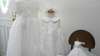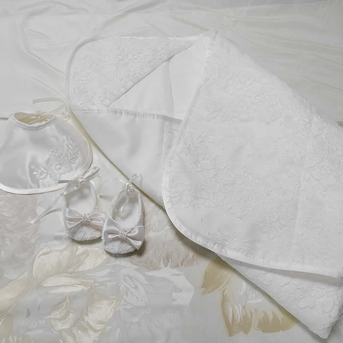 お宮参りセットはベビードレス&帽子とおくるみ、スタイ、シューズの5点セットです。