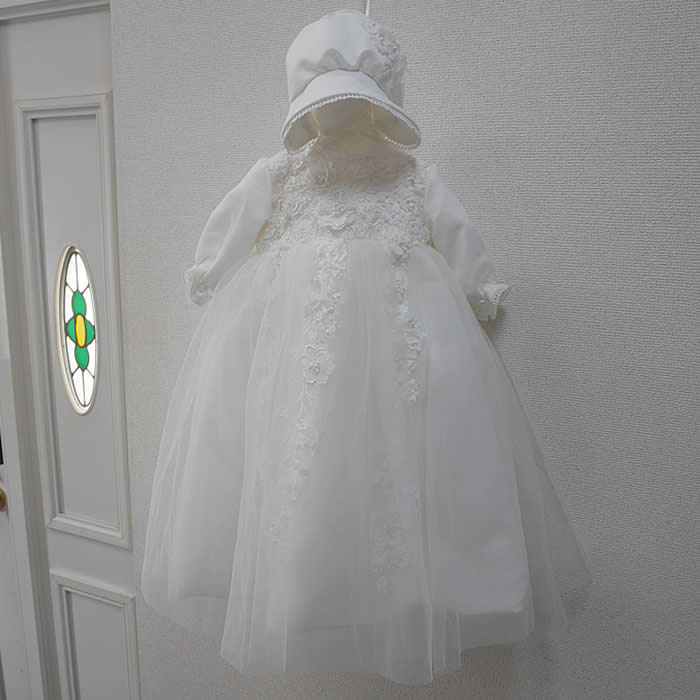 ベビードレスは元ドレスのイメージ似せてレースを流れるようにスカートにあしらいました。