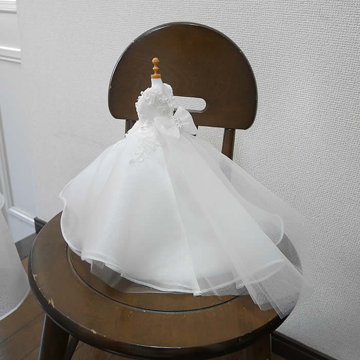 ドレスのオーガンジーとレースをたくさんあしらったキッズドレスです。