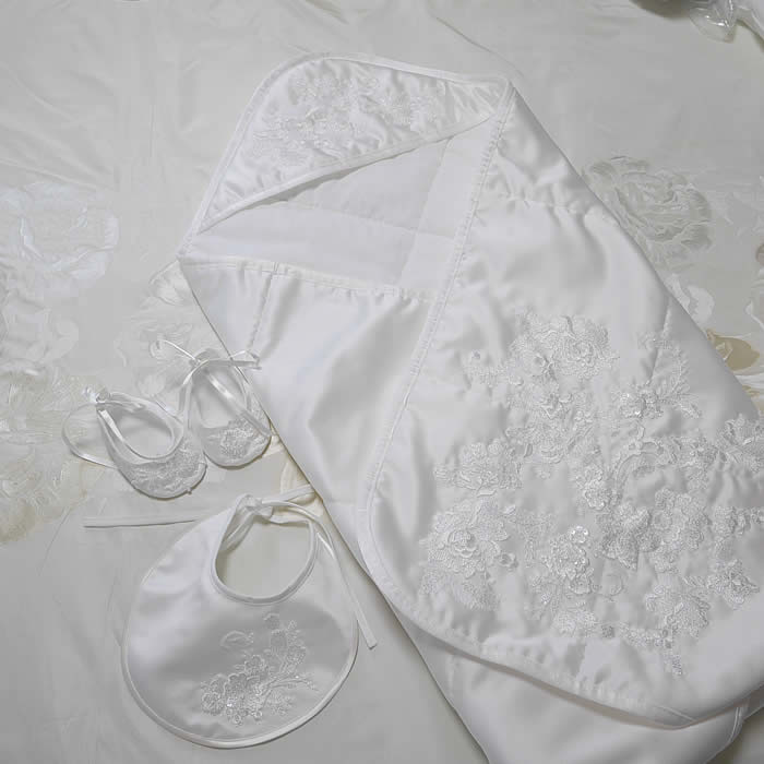 おくるみ、スタイ、シューズにもレースをあしらいました。