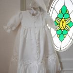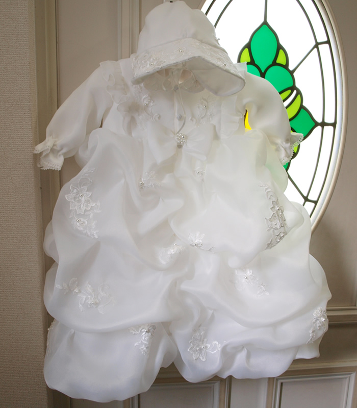 帽子も身頃もレースとフリルで装飾した可愛いベビードレスです。