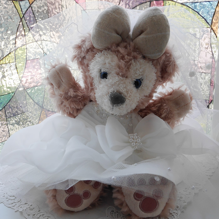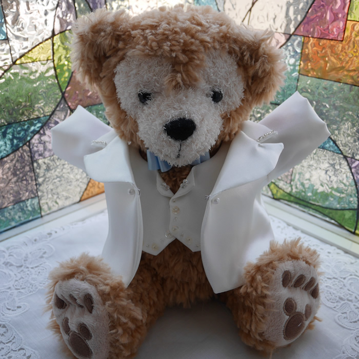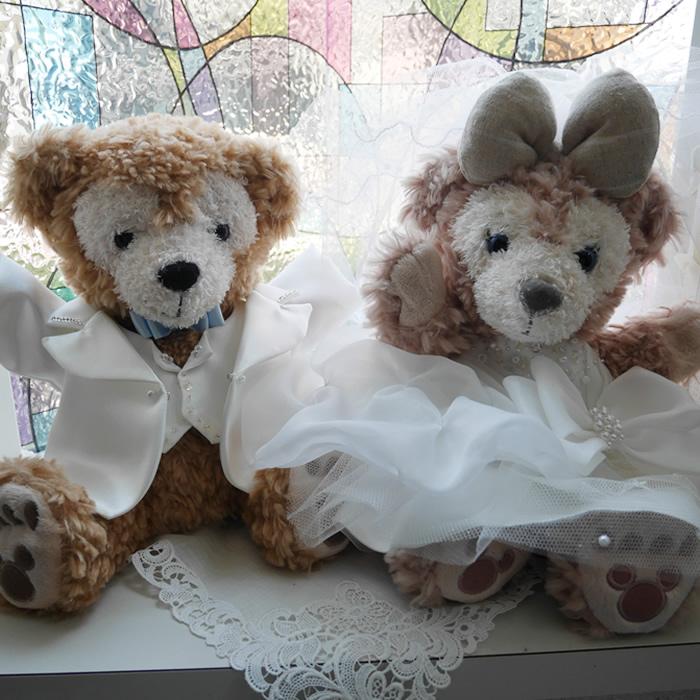 パペットのダッフィーとシェリーメイのウェディングドレスとタキシードです。