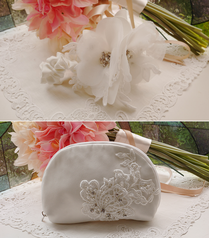 ベビーのヘッドドレスはママのドレスのコサージュをリメイク。