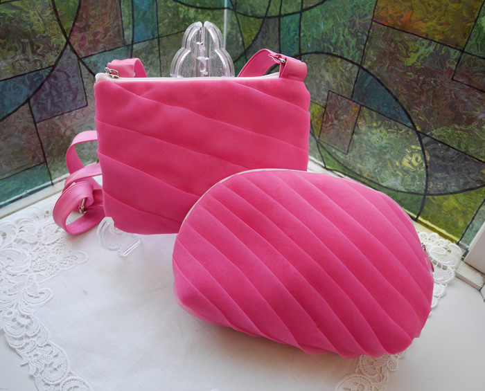 身頃のプリーツ使いを取り入れたポシェットはママのポーチともお揃いです。