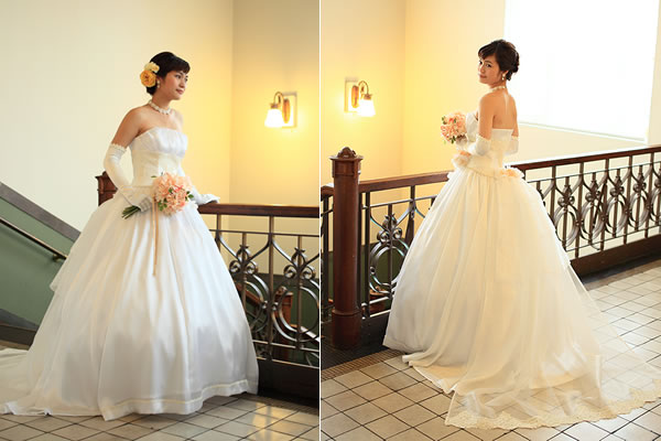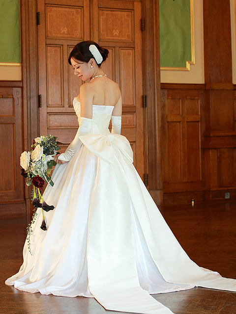 中世ヨーロッパの貴婦人のドレスに良く見られるバッスルスタイルのウェディングドレス