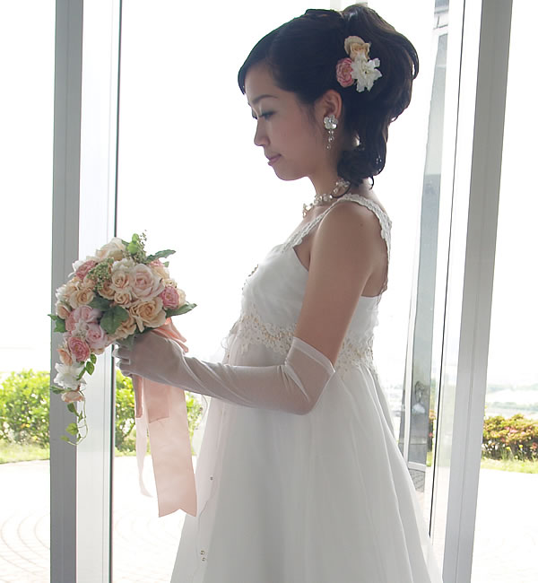 ストレッチ性の高い上質なオーガンジーが手にぴったりとフィットする肘上丈のウエディンググローブです。