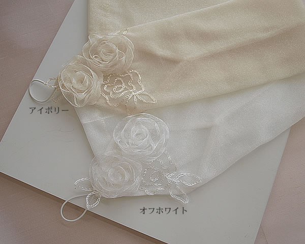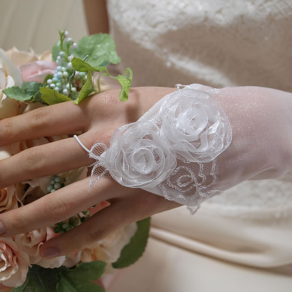 オーガンジーの巻きバラや刺繍をほどこしたグローブで手元まで優雅に。