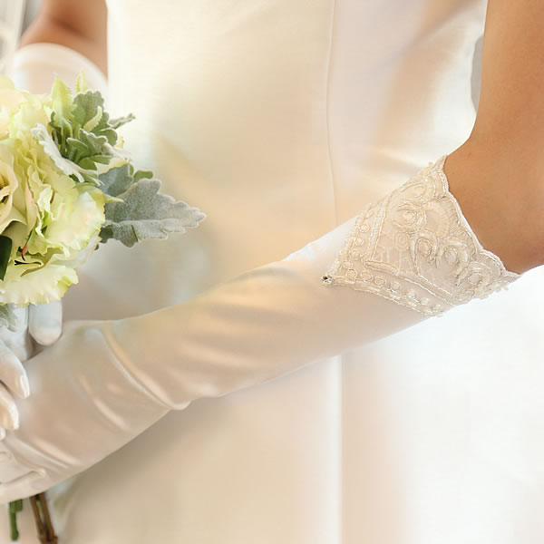 上品な光沢と適度なストレッチ性でドレス姿がグレードアップする肘下のミディアムグローブ。