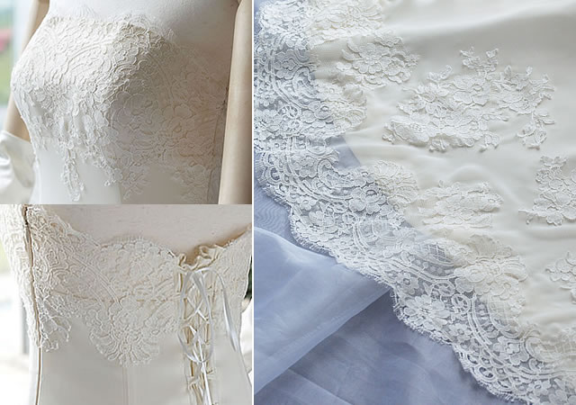 スカートの周囲にもレースを施し、360度どこから見ても上品な大人のドレスです。