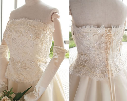 上半身前面にリバーレースを施し、さらに数種類のビーズや スパンコール・スワロフスキーを、ひと針ひと針刺繍しました
