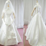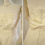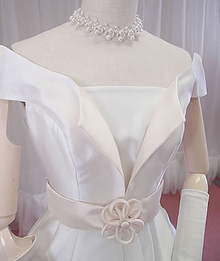 ミカドサテンでお作りした、シャープなイメージのAラインウェディングドレスです