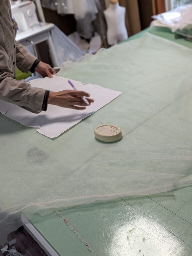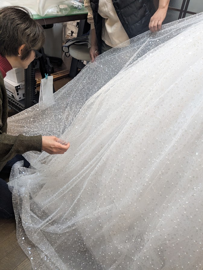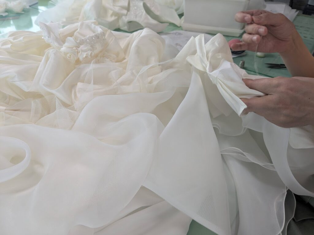 繊細なリバーレース、光を繊細に反射するシルク、そして何層にも重なるチュール……。 私たちは、かつて皇室の衣装製作にも携わったデザイナーの監修のもと、その一針一針に一切の妥協を許しません。