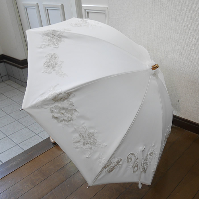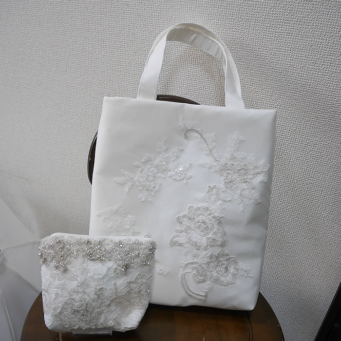 ウェディングドレスから日傘とサブバッグ、ポーチへリメイクしました。
