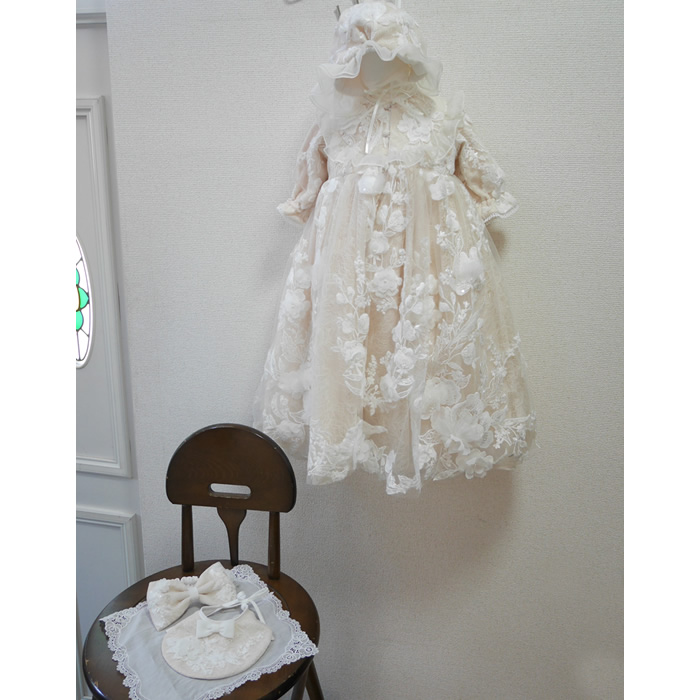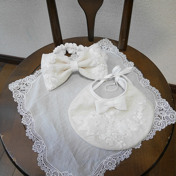 【ドレスリメイク】アイボリードレスのベビードレス ベビー・子供・出産準備品 2026.03.12 作品のご説明 ウェディングドレスからベビードレスやスタイ、ヘッドリボンをお作りしました。 中のサテン地がピンクを帯びたアイボリーで、レースがオフホワイトのドレスです。 優しい色合いのベビードレスに仕上がりました。 立体モチーフの流れるようなレースは上品な可愛さを醸しだしています。