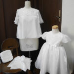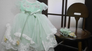 キッズドレスは元ドレスの胸元を再現し、タックをたたんだチュールにレースをあしらいました。