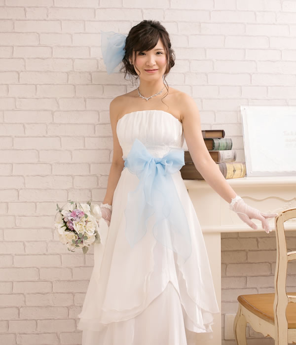 ふわっとエアリーで優しいオーガンジーのサッシュベルトとリボンのヘッドドレス。
