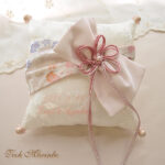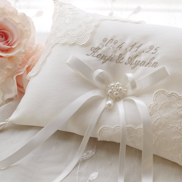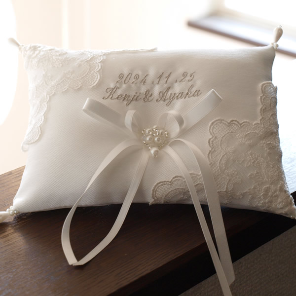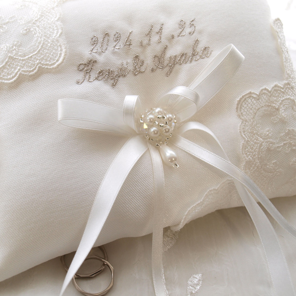 光沢の美しいミカドサテンに上質なレースをあしらったリングピロー。