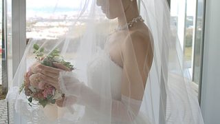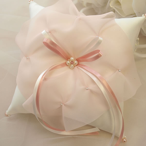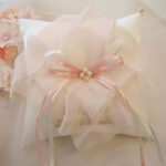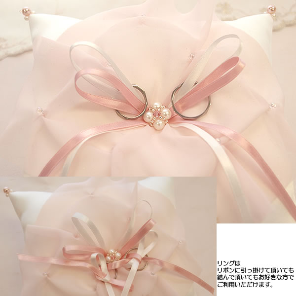 ふわふわしたベビーピンクのシフォンが愛らしいリングピロー。
