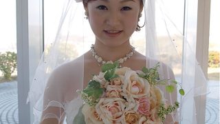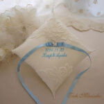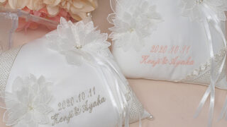 オフホワイトのリボンが可愛い、優しい色合いのリングピロー完成品です。