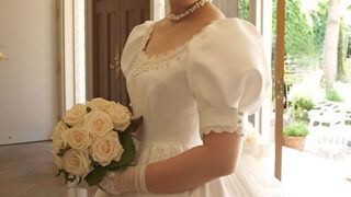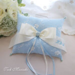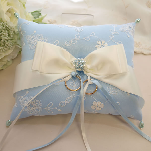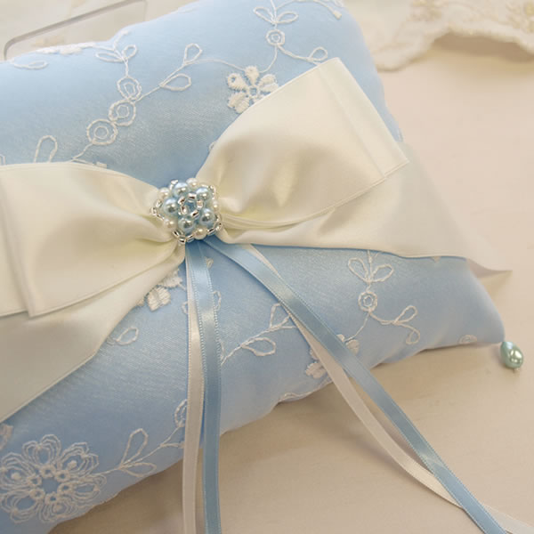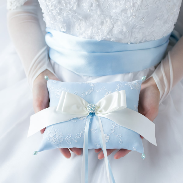 サムシングブルーのサテン地に愛らしいレースをのせました。