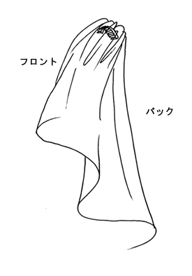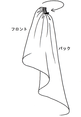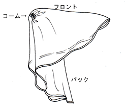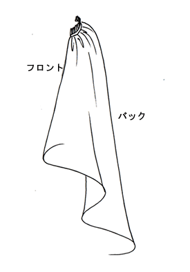 折り返した上の部分を『フロント』下の部分を『バック』と当店では呼んでいます。フロントとバックの境目はコームの付いている場所です。当店のベールのサイズ表記で『フロント○○cmバック○○cm』とあるのはこの位置の長さの事です。
