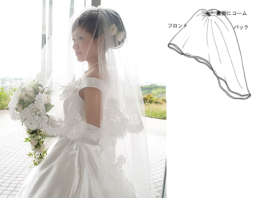 楕円(だえん)又は長方形のベールの途中を折り返して使用する形式のベールを『フェイスアップベール』と言います。 当店の場合、折り返し位置にコームを取り付けています。コームを髪にさして頂くだけで簡単に付ける事が出来ます。