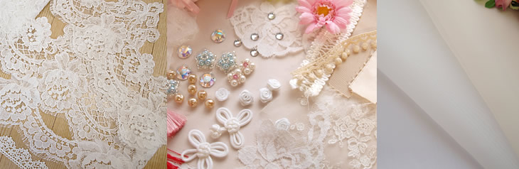 また、ドレス生地はもちろんレース等の素材も、たくさんご用意していますので是非、教室でご覧ください。